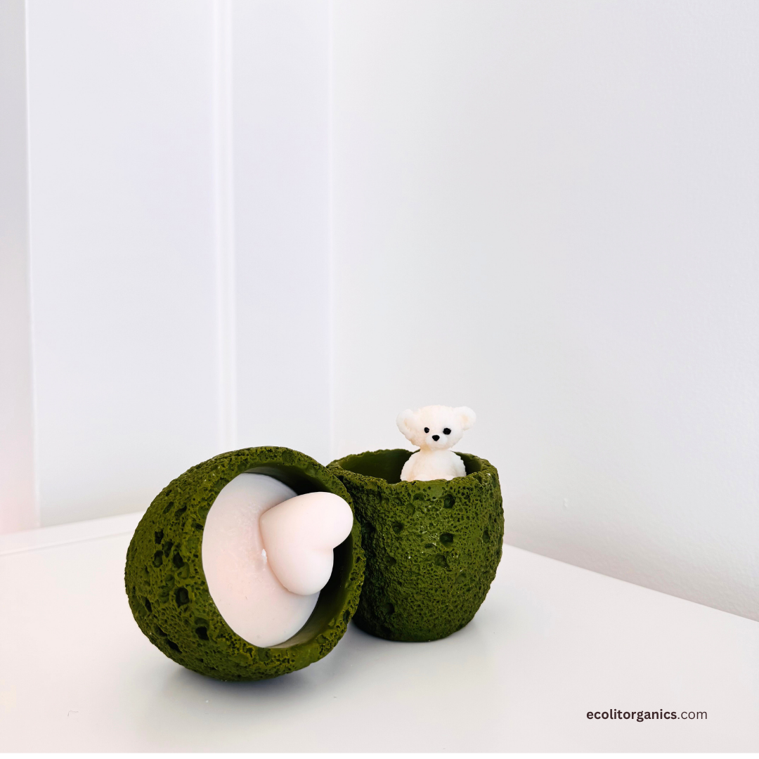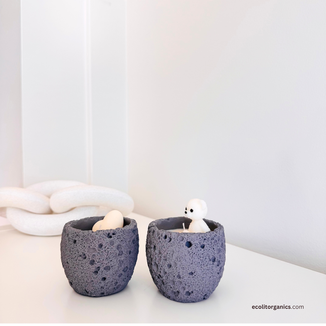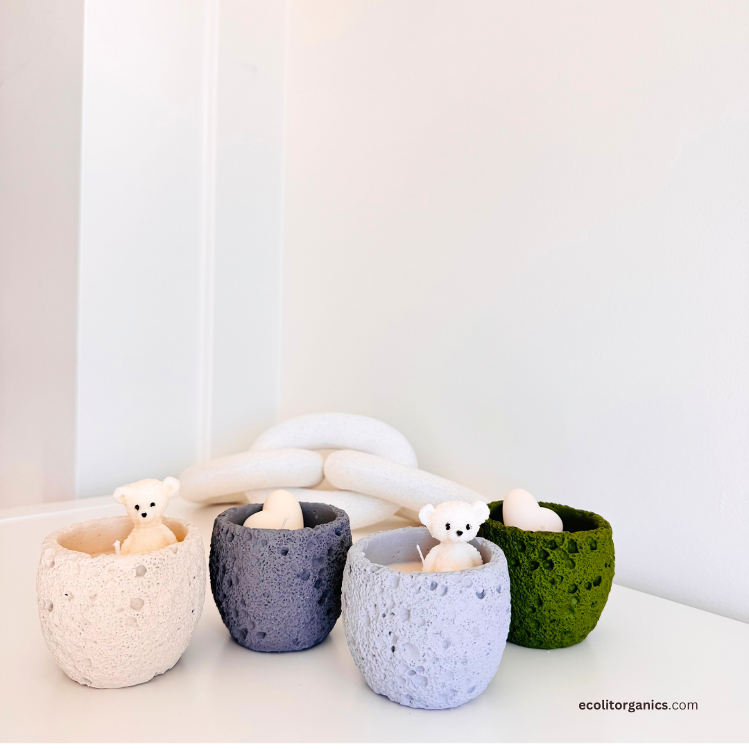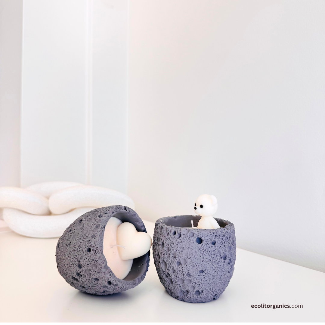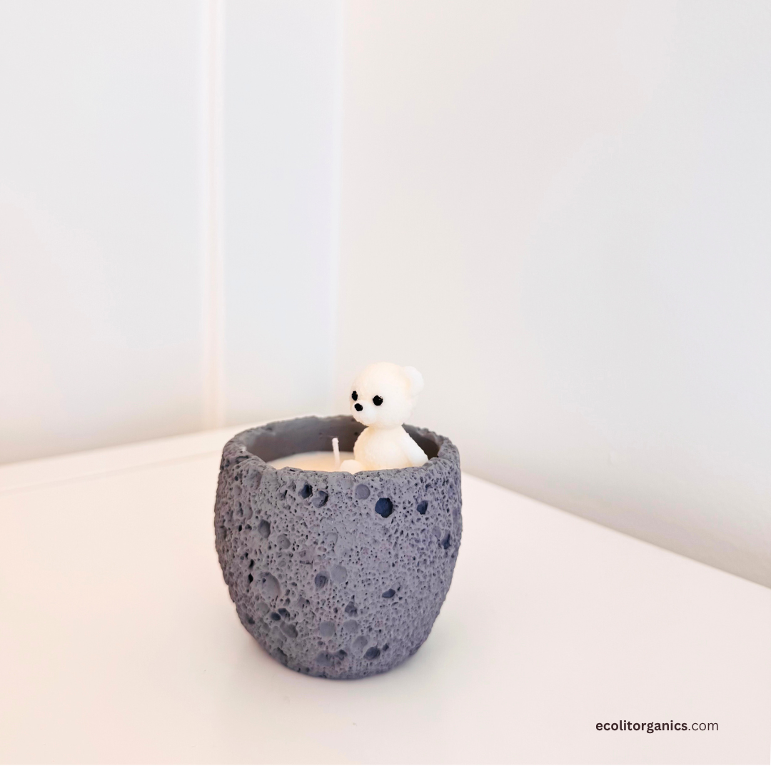 Charming mini candles in volcanic stone-inspired jars, each paired with a tiny bear or heart accent. The scent blends creamy vanilla and delicate orchid with a soft hint of amber; calm, cozy, and perfect for a gentle decorative touch or a thoughtful gift.